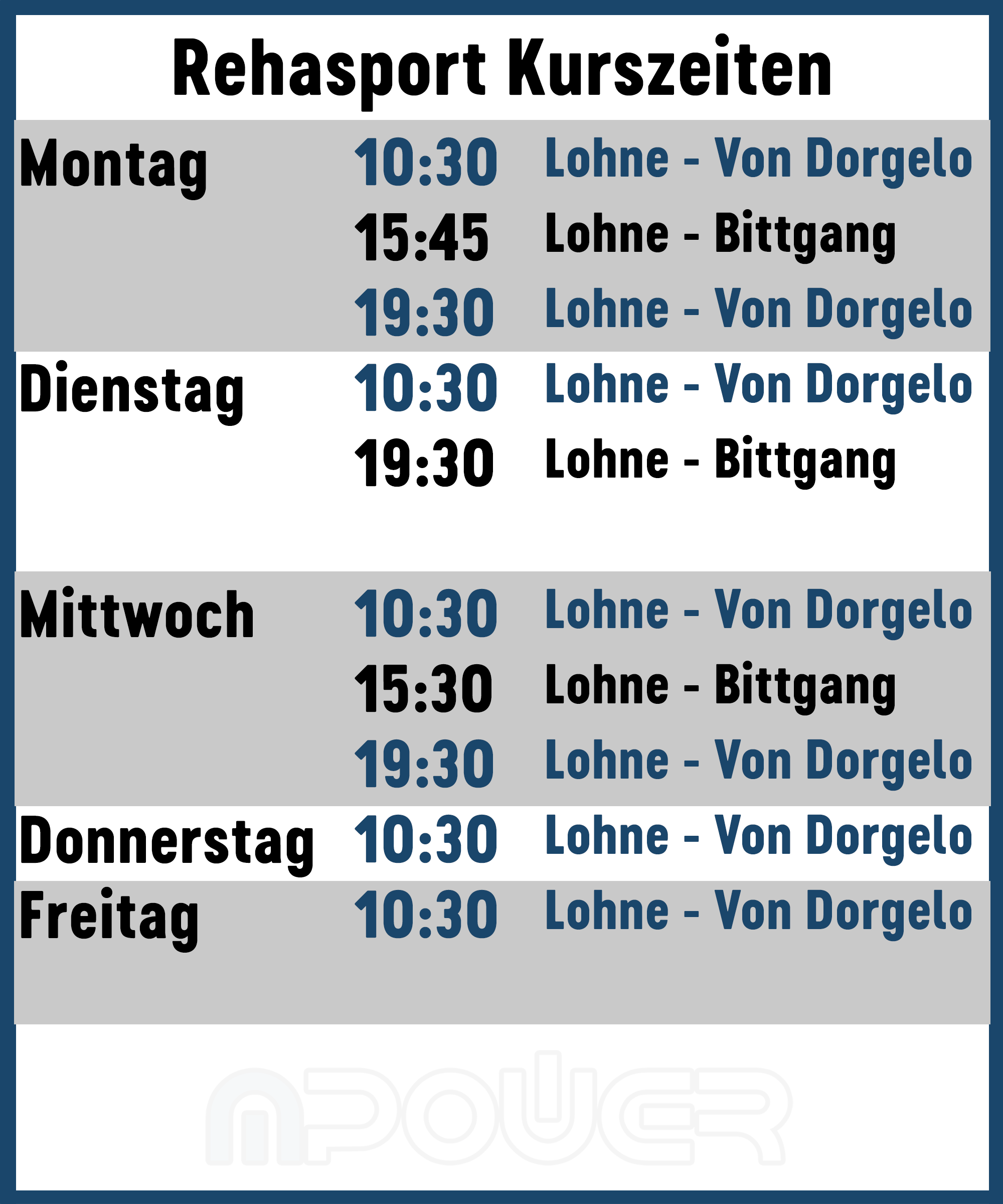 DAS ZIEL IST ES, DASS TÄGLICH REHASPORT-KURSE ZU DEN UNTERSCHIEDLICHSTEN ZEITEN ANGEBOTEN WERDEN. EINE ÜBERSICHT ÜBER DIE AKTUELLEN KURSZEITEN SIEHST DU AUF DEM BILD.